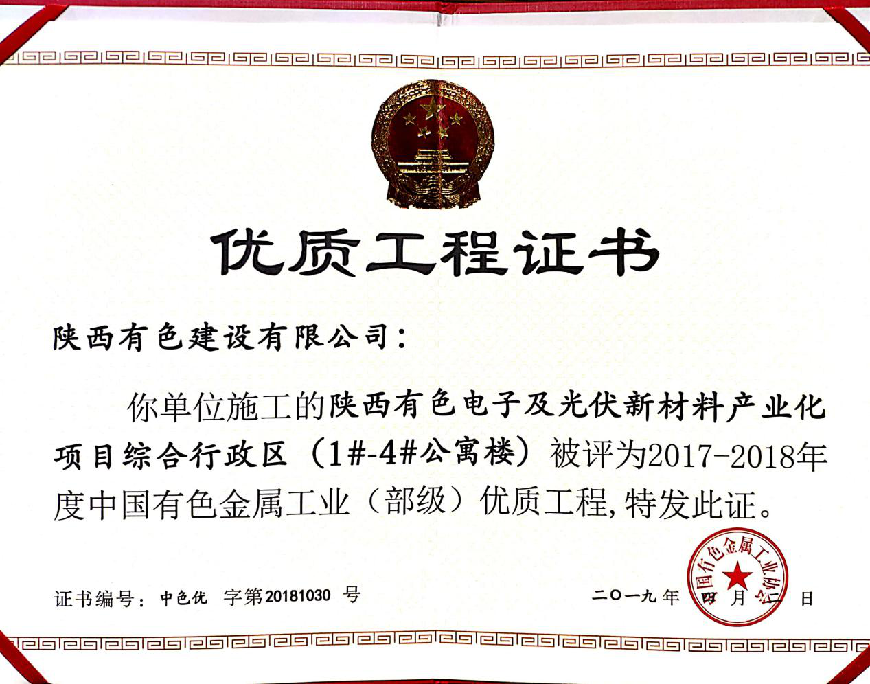 6月11日中國(guó)有色金屬工業(yè)協(xié)會(huì)召開2019年度有色金屬工業(yè)建設(shè)工程質(zhì)量監(jiān)督工作會(huì)議,表彰2017-2018年度中國(guó)有色金屬工業(yè)(部級(jí))優(yōu)質(zhì)工程。公司承建的陜西有色電子及光伏新材料產(chǎn)業(yè)化項(xiàng)目綜合行政區(qū)Ⅰ標(biāo)段:1#-4#公寓樓,綜合行政區(qū)Ⅱ標(biāo)段:辦公樓、職工餐廳、文體中心項(xiàng)目被評(píng)為2017-2018年度中國(guó)有色金屬工業(yè)(部級(jí))優(yōu)質(zhì)工程。