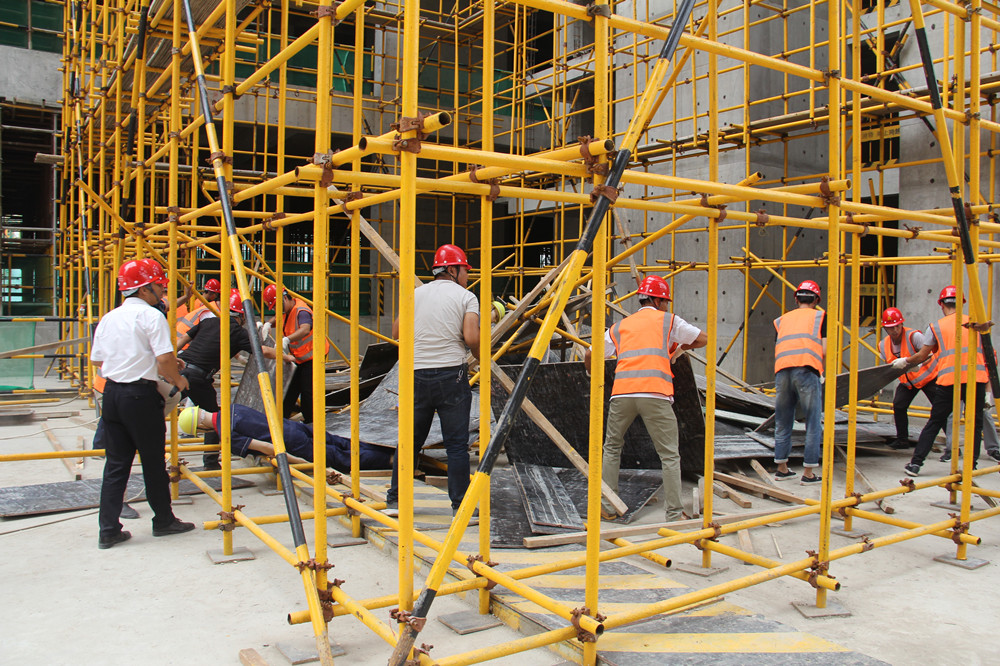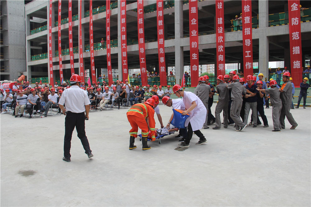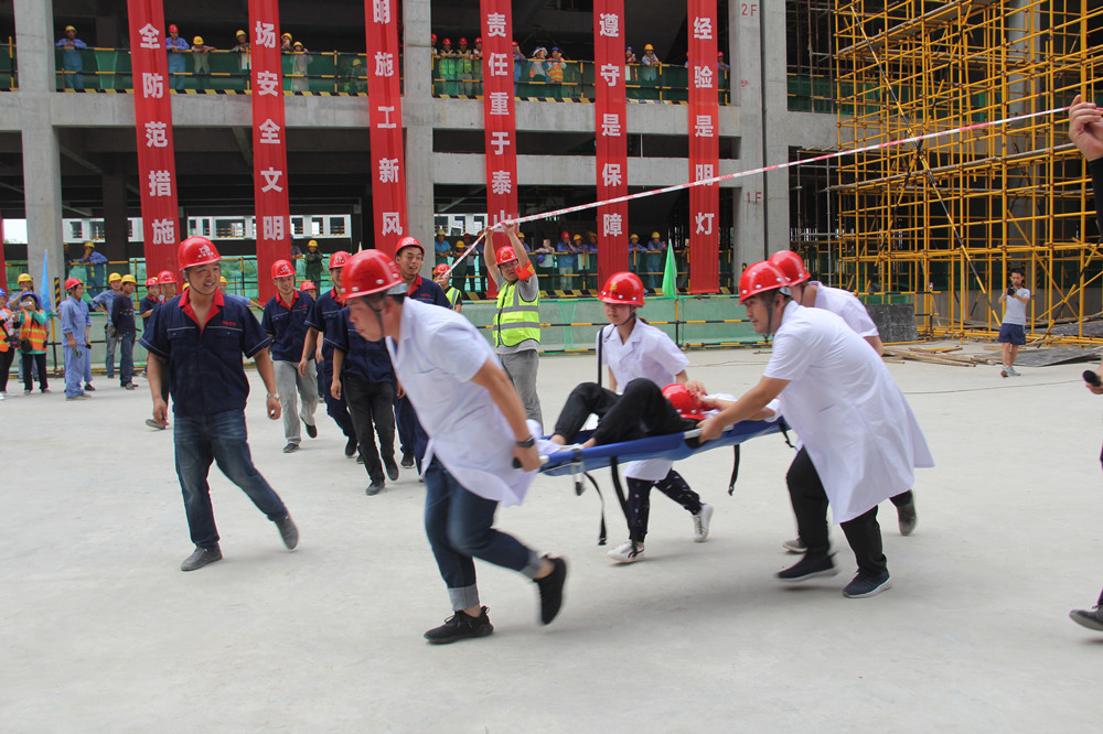 上午10:00整,隨著公司總經(jīng)理?xiàng)蠲麾暤囊宦暳钕?,演練正式開(kāi)始。本次高支模腳手架坍塌應(yīng)急演練主要模擬:2#商業(yè)屋面支設(shè)模板時(shí),由于工人在架體沒(méi)有加固完成及驗(yàn)收合格的情況下擅自作業(yè),導(dǎo)致坍塌事故,造成1名作業(yè)人員從工作面墜落,1名架體加固工人被掩埋。事故發(fā)生后,現(xiàn)場(chǎng)安全員發(fā)現(xiàn)情況后立刻按照國(guó)家《生產(chǎn)安全事故報(bào)告和調(diào)查處理?xiàng)l例》及《安全生產(chǎn)法》的有關(guān)規(guī)定,向項(xiàng)目負(fù)責(zé)人進(jìn)行匯報(bào),項(xiàng)目負(fù)責(zé)人立即啟動(dòng)《應(yīng)急救援預(yù)案》,一邊組織應(yīng)急救援小組迅速開(kāi)展自救,一邊向公司領(lǐng)導(dǎo)報(bào)告,并第一時(shí)間請(qǐng)求120、119等政府救援力量救援。接到險(xiǎn)情后,公司生產(chǎn)運(yùn)行部經(jīng)理張輝帶領(lǐng)公司應(yīng)急救援小組相關(guān)人員前往現(xiàn)場(chǎng),指導(dǎo)救援工作。項(xiàng)目部應(yīng)急救援小組有序展開(kāi)救援,搶險(xiǎn)組迅速進(jìn)入現(xiàn)場(chǎng)清理雜物,排查危險(xiǎn)源防止二次傷害發(fā)生;疏導(dǎo)組疏導(dǎo)事故周邊交通,指引救援車(chē)輛進(jìn)入事發(fā)現(xiàn)場(chǎng);醫(yī)療組在事故現(xiàn)場(chǎng)對(duì)一名傷員進(jìn)行了緊急救助,并將傷者移往安全地帶,隨即趕來(lái)的119、120人員,營(yíng)救了傷勢(shì)嚴(yán)重的另外一名工人;警戒組第一時(shí)間在現(xiàn)場(chǎng)設(shè)置了警戒線,維持現(xiàn)場(chǎng)秩序;調(diào)查組進(jìn)入事發(fā)現(xiàn)場(chǎng)對(duì)此次事故發(fā)生的原因展開(kāi)調(diào)查,收集資料,模擬演練完畢。