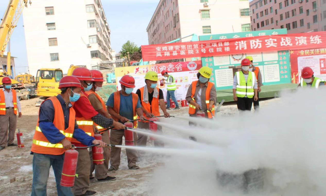 2020年6月是全國第19個“安全生產(chǎn)月”,為進一步加強項目安全管理工作,強化消防安全意識,認(rèn)真貫徹”安全第一、預(yù)防為主、綜合治理”的方針,全面落實安全生產(chǎn)主體責(zé)任,牢固樹立保安全就是保穩(wěn)定、保安全就是促發(fā)展的重要思想,有色陜建第二工程公司在鳳翔縣醫(yī)院項目部組織開展模擬消防安全演練活動。本次演練以模擬火災(zāi)發(fā)生后的組織滅火救援為主要內(nèi)容,鳳翔縣消防支隊、鳳翔縣縣公安局、縣醫(yī)院醫(yī)護人員、公司項目全體參建人員,項目其他建設(shè)單位300多人參加了此次演練活動。